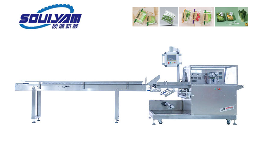 操作流程:人工在工作臺(tái)把蔬菜放入輸入輸送機(jī)-》葉菜包裝機(jī)完成自動(dòng)打孔-》自動(dòng)裹膜è廢料收集-》制袋成型-》橫封封切-》成品輸出-》進(jìn)入旋轉(zhuǎn)接料盤